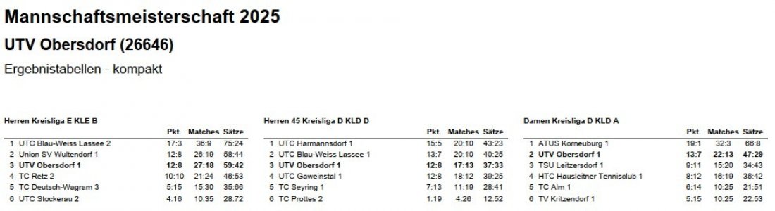 Die Herren Mannschaft des Union Tennisverein Obersdorf hat sich überraschend mit fünf Siegen in fünf Begegnungen souverän den Meistertitel in der NÖTV Kreisliga F, Gruppe D, gesichert. Am letzten Spieltag gegen den SU Pillichsdorf wurde es noch einmal spannend, aber bereits nach den sechs Einzeln st...